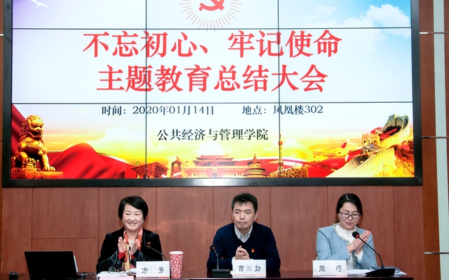 1月14日上午,上海财经大学公共经济与管理学院召开了“不忘初心、牢记使命”主题教育总结会,深入贯彻中央和教育部直属高校主题教育总结会精神与上海财经大学主题教育总结会精神,全面总结学院主题教育开展情况,巩固主题教育的成果,推动学院党的建设和事业发展取得新的突破。学院党委书记方芳全面解读了习近平总书记在“不忘初心、牢记使命”主题教育总结大会上的重要讲话,通报了学院领导班子专题民主生活会情况并作主题教育总结报告,上海财经大学党校副校长、党委组织部副部长、校主题教育领导小组办公室成员曹东勃同志出席了会议并讲话,学院党委副书记周巧主持了会议。学院领导班子成员、党委委员、基层党支部书记及支部委员、师生党员代表及党外代表共计49人出席了总结会。