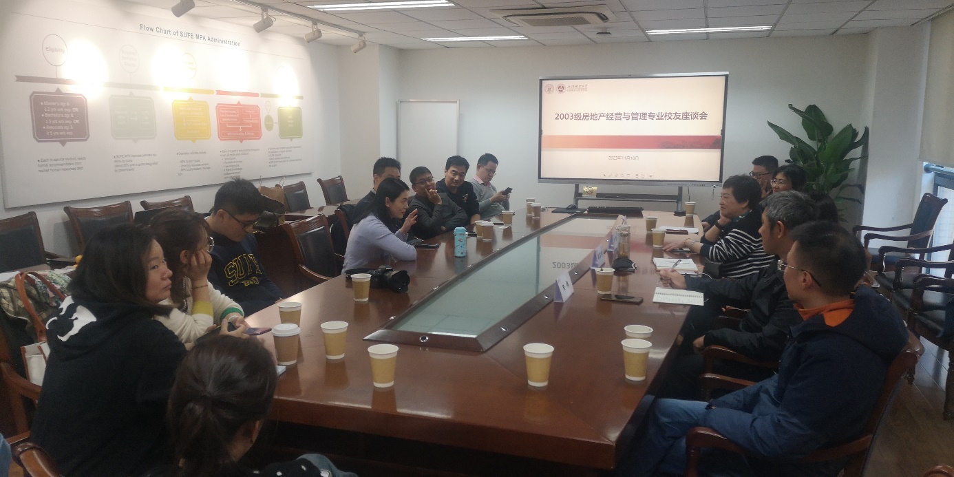 2023年11月18日,适逢上海财经大学106周年校庆,公共经济与管理学院迎来了2003级房地产经营与管理专业的二十余位校友,参加“相识二十周年返校”活动。当天下午,校友们受邀就本科房地产专业的转型与发展进行座谈,当年的任课教师副院长冯苏苇教授、时任学院中外合作办公室主任的原学院党委书记方芳教授、房地产教研室主任朱祎和03级房地产专业班主任华锦阳等老师出席了本次座谈会。