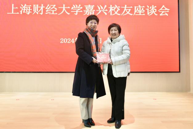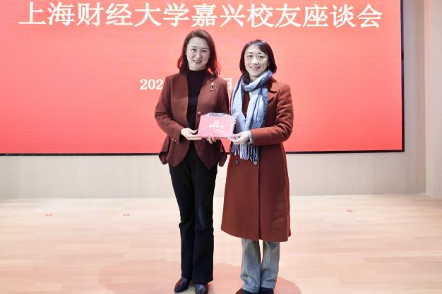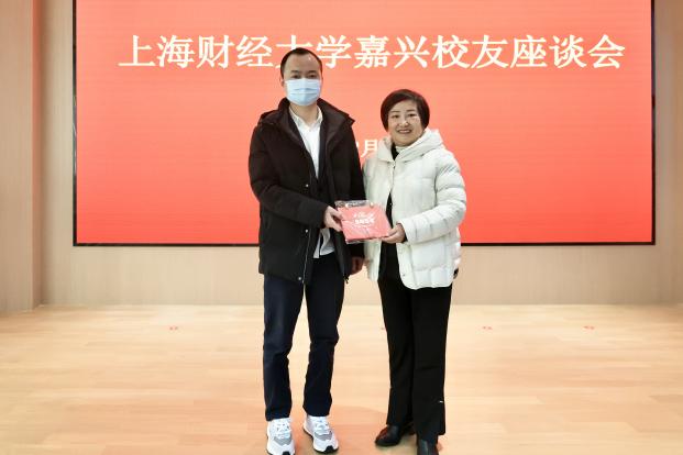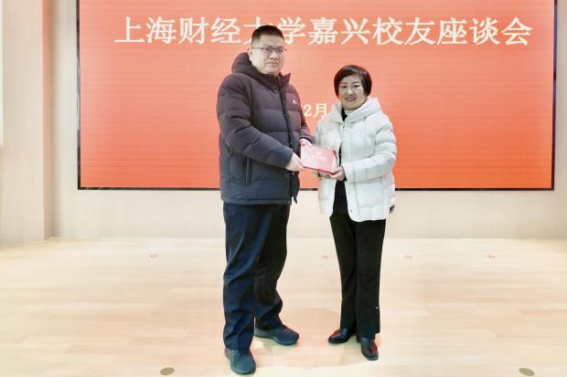 秦文佳书记与方芳主任分别为嘉兴校友赠送印有上海财经大学现状风貌的校友会新年台历,并合影留念。