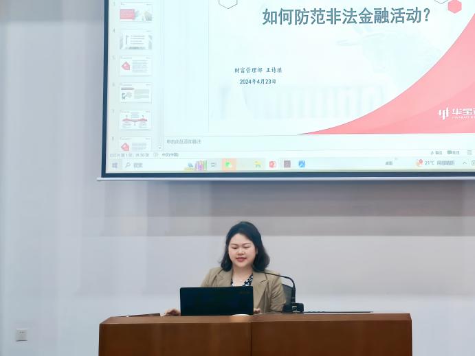 接着,王诗琪校友以“如何防范非法金融活动?”为主题,用情景演绎的方式与同学们介绍了几个非法证券期货活动的典型案例,并分享了一些日常“防非”小妙招,警示同学们在参与市场投资时,应充分了解市场情况,制定合理的投资策略,并注重风险控制,避免盲目跟风或过度交易。