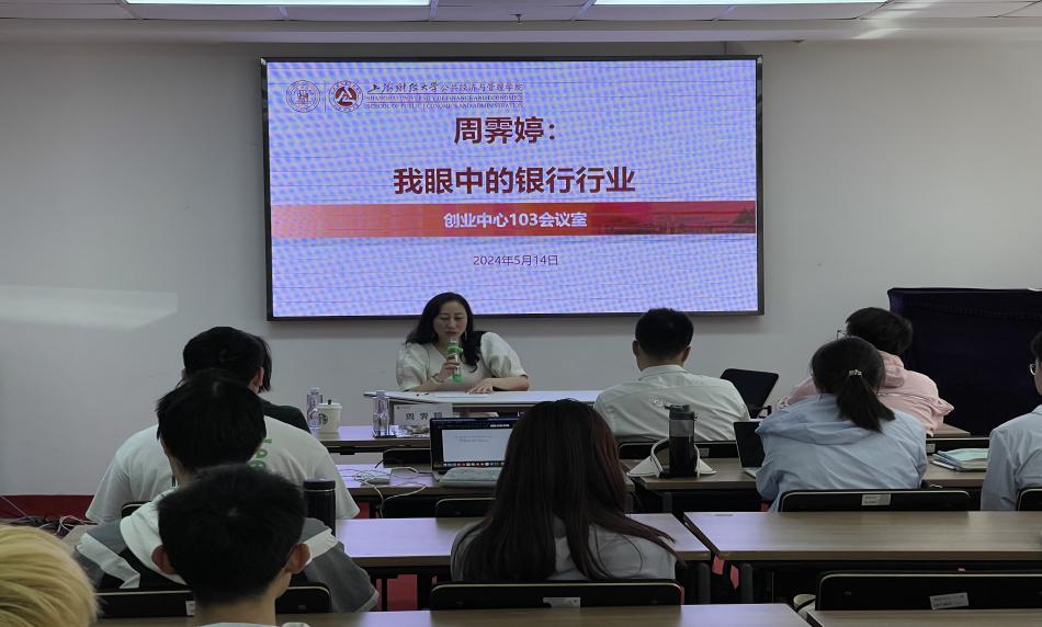 第二位分享的是周霁婷校友。她首先从银行的组织架构出发,详细地介绍了银行各个部门、层级的业务工作,加深了同学们对于银行不同部门、不同职责的了解。接着,她分享了个人从建行的客户经理发展到中信银行支行零售分管行长的励志生涯道路,以亲身工作经历告诉同学们要找到适合自己的工作,并正视工作中的每一个岗位、每一段时期,这样方能有所成就。