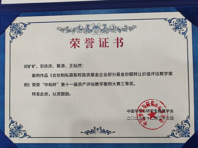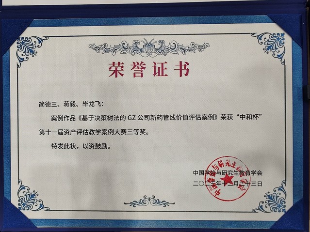 开幕式后,大会举行了第十一届全国资产评估教学案例大赛颁奖仪式,由中和资产评估有限公司董事长杨志明先生向获奖案例团队颁奖。我院资产评估研究生教育中心提交的参赛案例《合伙制私募股权投资基金企业部分基金份额转让价值评估教学案例》(作者:邓旷旷、宗庆庆、蔡源<校外导师>、王灿然<学生>)以及《基于决策树法的GZ公司新药管线价值评估案例》(作者:简德三、蒋毅<校外导师>、毕龙飞<学生>)荣获三等奖。
