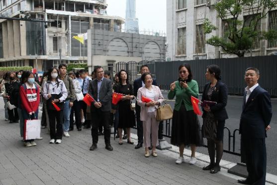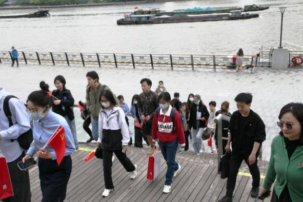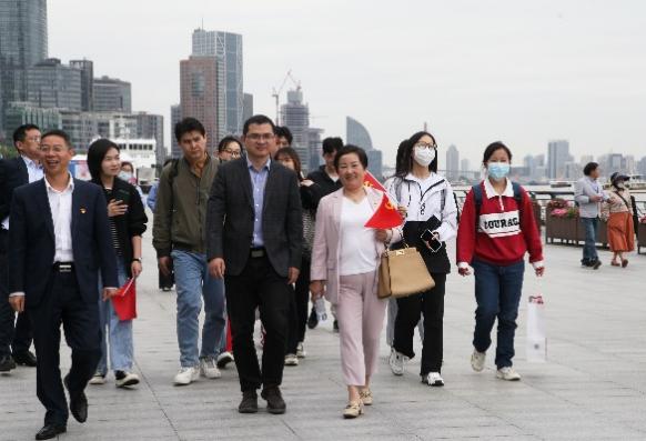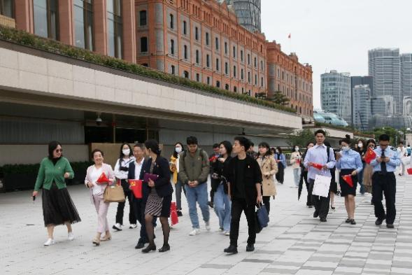 在第三板块“青春·更昂扬”中,全体师生党员共同开展了一堂“北外滩初心启航”行走的党课。他们在虹口区委党校李银娥老师的讲解下,从汇山码头出发,一路经过了世界会客厅、上海大厦等文化历史地标,追寻上海的红色印记,用心感受上海城市红色文化底蕴,更深地体会习总书记关于“人民城市人民建,人民城市为人民”的指示,浦江两岸的历史风貌和发展轨迹使大家都深深感受到了中国式现代化的高质量发展进程。在行走的党课同时,我院师生党员与税务局、北外滩街道和中信银行党员们一路走、一路听、一路问,一路交流,他们结合自己的税务、公共管理和投资学专业,调查了解上海税务、基层政府治理和投融资的实务,进行主题微调研,了解了实际工作中的难点和痛点,他们表示将通过运用各自的专业理论知识进行破解式研究,将研究做在祖国大地上,为我国社会主义现代化高质量发展献计献策。