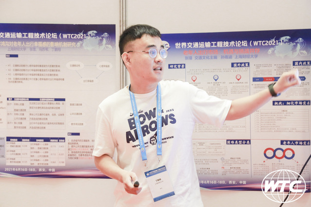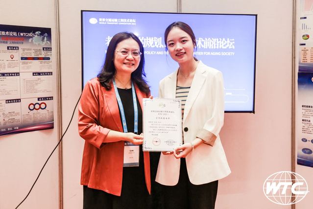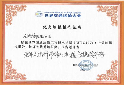 除了现场的演讲环节,本次WTC会议还设有优秀墙报报告评选活动,在800多份墙报中遴选出5%的优秀作品。经过激烈的角逐,孙雨涵同学与张瑾老师合作的海报作品《老年人出行市场:机遇与挑战并存》脱颖而出,获优秀墙报奖。孙雨涵出席了世界交通运输工程技术论坛(WTC2021)优秀墙报报告的颁奖仪式。WTC官网对“老龄交通的规划、政策与技术前沿” 分论坛进行了专题报道(https://mp.weixin.qq.com/s/2gnHcwpBzMLR8NMeeJn3tg)。