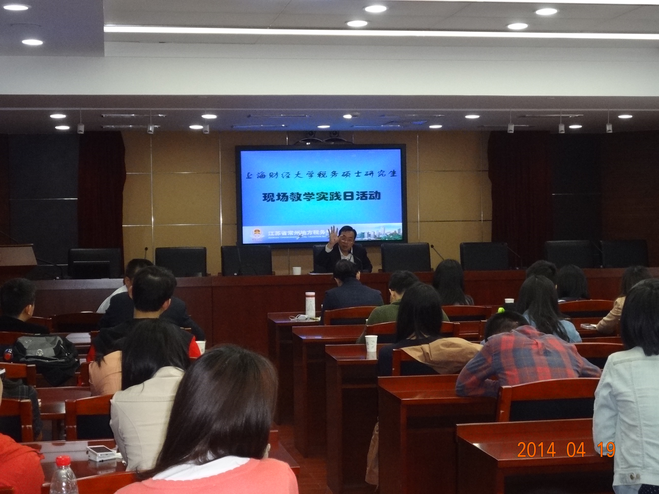 当天下午,师生们来到常州市地税局,与地税局领导和部分业务处室负责人一起交流互动。在观看过介绍常州市“纳税人之家”建设的视频材料之后,我校税务硕士外聘导师钱俊文局长首先就税收法定、税制建设和征管改革等内容为师生们做了一场精彩的现场讲座,并对学生们提出几点期望,希望大家能够认真钻研,加强理论学习,将所学应用于实践。讲座结束后,同学们意犹未尽,与地税局领导进行了积极的互动,活动现场气氛活泼、热烈,钱局长不仅对所提出的问题进行了解答,还列举了很多理论联系实际的例子,让大家豁然开朗。