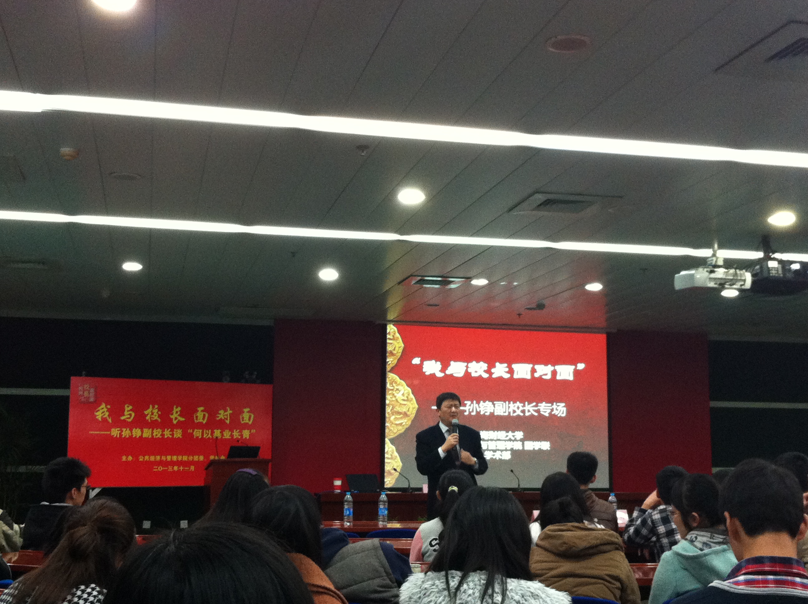 这是公共经济与管理学院分团委学生会主办的“我与校长面对面”系列活动的第二场,继上学期第一次活动请到樊丽明校长后,这个活动受到全校学生的广泛关注和一致好评,本学期我们有幸邀请到了我校副校长孙铮教授,与上财学子面对面共同探讨百年财大何以基业长青。