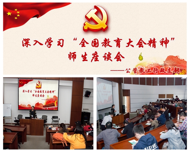 学院党委周巧副书记作为教工行政支部的党员,带领大家深入地学习领会了全国教育大会的精神,希望各位学生骨干和教工党员能够贯彻落实并向非党员师生传达大会的精神。周巧老师指出,本次大会确定了教育的一个根本任务就是要培养社会主义接班人和建设者,拥护中国共产党和我国社会主义制度,励志为中国特色社会主义奋斗终生的有用人才。我们教师在做好教学和服务工作的同时,也希望各位同学能从以下6个方面“下功夫”。一是坚定理想信念,在教师的引导下树立共产主义远大理想和中国社会特色主义的共同理想,增强理论自信,制度自信和文化自信。二是厚植爱国主义情怀,我们学院本身就具有公共视野和公共情怀的学院,作为公管的学生应该将爱国、爱党、爱校的情怀扎根在心中。三是加强品德修养,高等教育的根本任务是立德树人,希望学生能够在为人处事上,学会换位思考,在集体中多合作,具有奉献精神。四是增长知识见识,珍惜时光,心无旁骛的求知求学,为将服务国家建设打下扎实的基础。五是坚持奋斗精神,作为青年一代的学生要敢于担当,要有不懈奋斗的精神,拥有乐观向上的生活态度,做到刚健有为自强不息。六是增强综合素质,教工行政支部的老师,工作范围都是紧紧围绕培养提升学生综合素质,提供帮助和搭建平台,学生有问题和需求也可以多和行政支部的教务老师沟通。