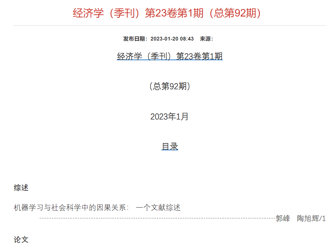据《经济学(季刊)》官网显示,我院投资系副教授郭峰老师和我院社会保障学专业博士研究生陶旭辉同学在《经济学(季刊)》2023年第1期上发表论文《机器学习与社会科学中的因果关系:一个文献综述》。这篇论文是经济学季刊2023年的开年卷首论文。